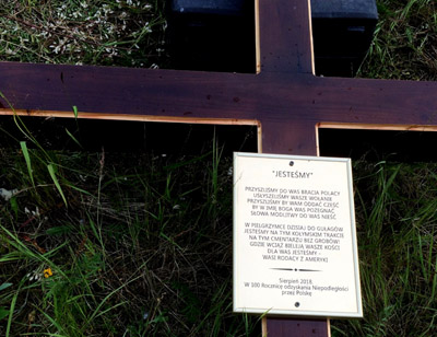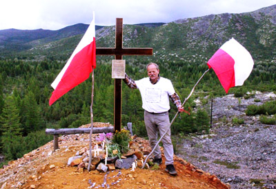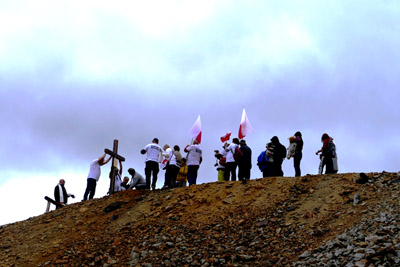 W symbolicznym, a i dość dramatycznym pochodzie, zanieśliśmy na ramionach ten krzyż, jako symbol naszej pamięci i hołdu dla naszych zamordowanych tam Rodaków, których jedyną winą był o to, że byli Polakami! Do wykopanej przez nas na szczycie nasypu dziury wsypałem ziemie przywiezioną z Polski zabraną spod kościółka (XI wiek) z mojego rodzinnego Siewierza. Do pustego już naczynia nabrałem zaś ziemi wykopanej spod krzyża. A gdy już krzyż stanął, został poświęcony przez podróżującego z nami księdza Andrzeja.
