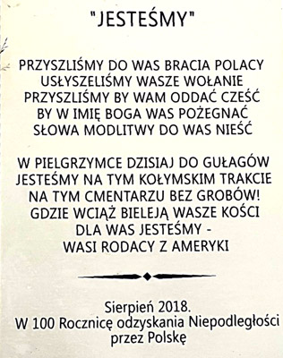 Wtedy niespodziewanie zadzwonił telefon od nieznanego mi wcześniej Pana Adama z pytaniem „Wiem, że jedzie pan na Syberię, czy może zabrać pan mój wiersz dla pewnej pani w Wierszynie?” Oczywiście, że mogę – odpowiedziałem. A gdy ten wiersz przeczytałem, zapytałem go, czy nie zechciałby napisać wiersza – hołdu na nasz krzyż. Po kilka dniach otrzymałem pierwszą 4 zwrotkową wersję. Wspólnymi siłami udało się z niego zrobić dwie zwrotki i nadać tytuł: „JESTEŚMY”.