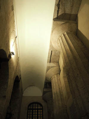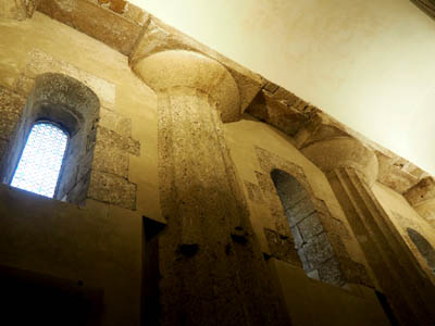 Doryckie kolumny tamtej budowli widzimy w bocznej, północnej ścianie świątyni, jeszcze więcej i piękniej wyeksponowano je w środku. To najbardziej zachwycający element tego kościoła. Pokazuje jak nowe powstawało na starym, stare porastało nowym, jak nakładały się na siebie epoki, zachowując to, co potrzebne i piękne.