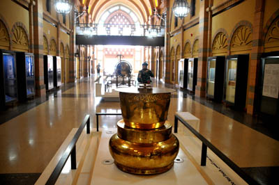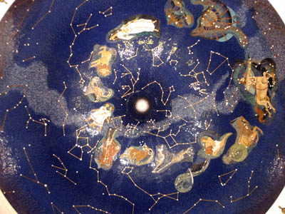 Pośrodku długości muzealnego gmachu jest główne wejście do niego z nadbudową drugiego piętra, jak gdyby wieży z pozłacaną kopułą. Jej wewnętrzną część, nad mieszcząca się w niej kwadratową salą, pokrywają malowidła nieboskłonu, ze znakami zodiaku i wpisanymi w nie gwiazdozbiorami.