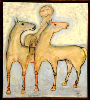 Rzeźba wydaje się być marginesem i to raczej mało interesującym. Dokładniej oglądam niektóre portrety, z postaciami ludzi łączonych z ptakami lub końmi.