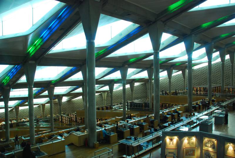 Budowa ruszyła w 1995 roku, a obok egipskich działały tu firmy brytyjskie, włoskie, amerykańskie, norweskie… Efekt tego, co powstało jest doprawdy imponujący. Już sam widok czytelni, w której zasiąść może jednocześnie 2000 osób przyprawia o zawrót głowy. Z komputerów, z dostępem do Internetu, może korzystać jednocześnie 600 osób. Czytelnia jest częścią Głównej Biblioteki, zajmującej powierzchnię 36.770 metrów kwadratowych powierzchni (cała biblioteka ma 85.405 metrów kwadratowych), której zbiory tarasami umieszczono na siedmiu poziomach – od „korzeni wiedzy” po „nowe technologie”. Na wszystkich tych poziomach znajduje się ponadto 200 niewielkich „study rooms’, w których podczas pracy można korzystać ze wszystkich dobrodziejstw współczesnej techniki.