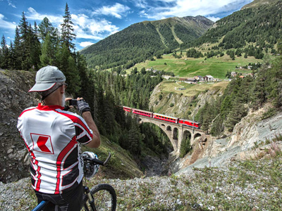 Korzystając ze słynnego Expressu Bernina można wysiadać, odbywać np. 3 godzinne przejażdżki rowerowe na trasie 42,6 km, na wysokości 1350 m n.p.m., z pokonywaniem różnicy poziomów 680 m i następnie wsiadać do któregoś z następnych pociągów. Do dyspozycji kolarzy są też specjalne hotele, parkingi oraz przewodnicy rowerowi. Szczegóły znaleźć można na www.rhb.ch/bike i www.graubunden.ch/bike.