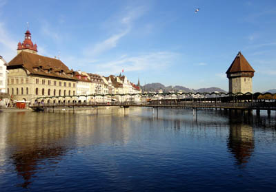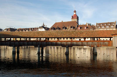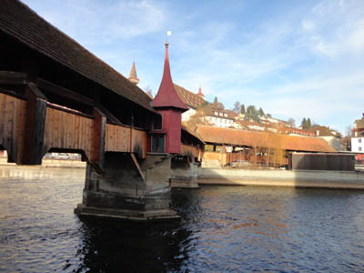 Ale również oba zabytkowe mosty. Za plecami naszej przewodniczki widzimy sławny Kapellbrücke – Most Klasztorny, 200 metrowej długości, wzniesiony w 1333 roku, najstarszy drewniany w Europie, kryty spadzistym dachem. Odbudowany po pożarze w 1993 r. Ma on niezwykły kształt.