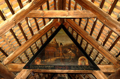 Też identycznie zadaszony oraz ozdobiony kilkudziesięcioma trójkątnymi obrazami przedstawiającymi sceny z ludźmi oraz śmiercią w postaci kościotrupa. Z odwiecznym Memento Mori – pamiętaj o nieuchronnej śmierci.