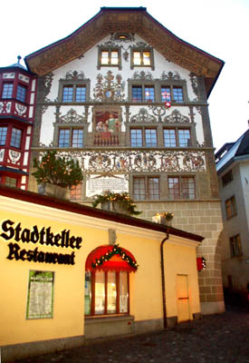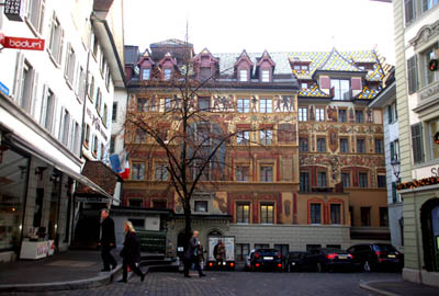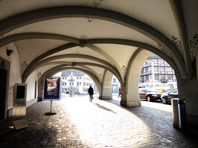 Od 1804 r. mieści się w nim siedziba parlamentu kantonu, nazywany jest więc również Pałacem Rządowym (Regierunsgeäude). Ale o nim napiszę osobno, gdyż na najwyższym piętrze jego krużganków wychodzących na wewnętrzny, kryty dachem dziedziniec, znajduje się słynny cykl barokowych obrazów Jakoba von Wila z początku XVII w. – Totentanz – Taniec Śmierci.