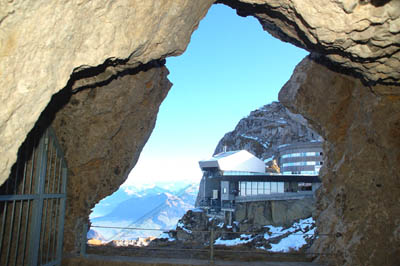 I wwożącej ich ostro w górę nad przepaściami i dolinami do górnej stacji. Znajduje się ona u podnóża okrągłego, dwupiętrowego hotelu Bellevue zbudowanego na platformie. Wychodzi się z niej na szeroką skalną półkę na zboczach ze szczytami m.in. Oberhaupt (2106 m n.p.m.), Chriesiloch i najwyższy Tomlishorn (2132 m n.p.m.). Na każdy z nich prowadzi szlak turystyczny.