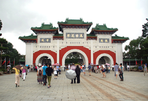 A pozowały chętnie. Obiekt ten zwany niekiedy pomnikiem, znajduje się w północnej części miasta, niedaleko od dużego, zabytkowego dużego Grand Hotelu zbudowanego w kształcie kilkupiętrowej, prostokątnej pagody. Do Martyr’s Shrine prowadzi, podobnie jak do CKS Memorial Hall o której pisałem w jednym z poprzednich reportaży z Tajwanu, brama z trzema arkami oraz wieżyczkami nakrytymi ciemno zielonymi dachami w stylu pagód.Przy bramie tej stoi pierwsza z wart honorowych. Po przeciwległej stronie dosyć rozległego placu znajduje się kompleks świątynno – memorialny, dla którego tłem są zielone wzgórza.