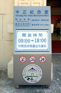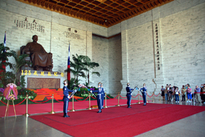 Do gmachu tego prowadzi 89 kamiennych stopni symbolizujących lata które przeżył Czang, z białymi płotkami – poręczami po bokach i środku. Przypomina to wejścia do pawilonów pałacu cesarskiego w Zakazanym Mieście w Pekinie. Wewnątrz głównym pomieszczeniem jest rozległa centralna hala na całą wysokość budowli.Pod ścianą vis a vis wejścia stoi kilkumetrowy, na masywnym, pokrytym napisami postumencie, odlany z brązu pomnik siedzącego prezydenta. Chińskie napisy są również na wykładanych marmurami ścianach tej hali. Pokrywają ją dywany w kolorze bordo. Przed pomnikiem zawsze stoi warta honorowa, a odbywające się co godzinę jej zmiany są zarazem kilkuminutowymi pokazami musztry i żonglerki karabinami, przyciągającymi zwiedzających.