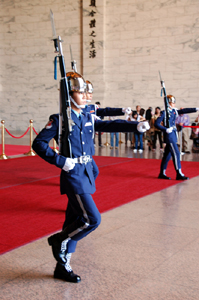 Warta honorowa pełniona jest również przed niewielką salą grobową najdłużej sprawującego władzę prezydenta. W Hali Pamięci znajduje się także biblioteka, muzeum poświęcone życiu Czang Kai-szeka. M.in. z, w mojej ocenie, trochę socrealistycznymi obrazami. Są sklepy i stoiska z drogimi w porównaniu z placówkami handlowymi w mieście pamiątkami.
