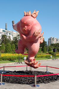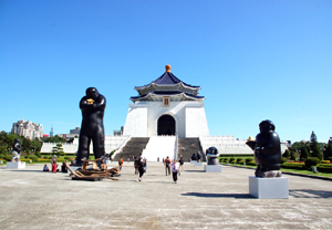 Zapraszając w jednym z nich mnie i innych zwiedzających do degustacji różnych gatunków herbaty, namawiano do kupienia jej w specjalnym, upominkowym pudełku, ale za zniechęcającą do tego cenę. Nie brak, oczywiście, kawiarenki oraz automatów z gorącą kawa i napojami chłodzącymi. Wspomniałem o alei prowadzącej od bramy głównej do CKS Memorial Hall.Stoją w niej również współczesne rzeźby. W większości wykonane w czarnym, polerowanym kamieniu, ale kilka także w kolorze pomarańczowo – różowym. Przedstawiają grube, udziwnione, dla mnie kiczowate figury ludzkie. Na obrzeżach tego kompleksu znajdują się tereny parkowe, a tuż obok niego tętniące życiem centrum stolicy. Raz to na pewno warto zobaczyć.