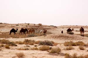 Na północnym pograniczu saharyjskiego Wielkiego Ergu Wschodniego. Mijamy stojące przy drodze duże czerwone tablice z sylwetkami wielbłądów, tak jak u nas krów czy dzikich zwierząt, ostrzegające w trzech językach: arabskim, francuskim i angielskim, że szosa krzyżuje się z tradycyjnymi szlakami wędrówek wielbłądów.