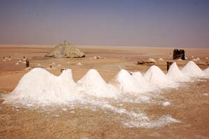 Spotykamy te zwierzęta zresztą w grupkach po kilka pasących się bez nadzoru w odległości kilkunastu – kilkudziesięciu metrów od drogi i umiejętnie wyszukujących nadającą się do jedzenia pustynną roślinność. Przejeżdżamy też przez tereny po wyschniętych słonych jeziorach, na których wydobywa się sól i usypuje z niej niewielkie białe kopczyki.