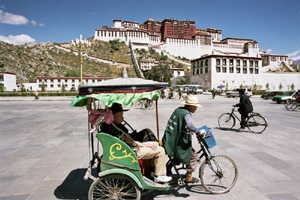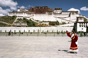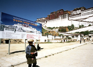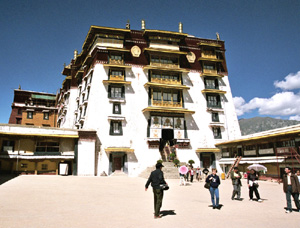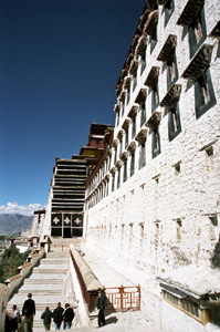 Widzę setki wspaniałych typów ludzkich, scen, dzieł sztuki, obiektów sakralnych. Niestety, fotografowanie wewnątrz pałacowych pomieszczeń, w muzealnych obecnie salach, jest absolutnie wykluczone. Na platformach, placykach, dachach – owszem. Z wielkiego dachu pałacu Potala roztacza się wspaniała panorama. Tuż przed nim jest duży plac z gładką nawierzchnią zbudowany na miejscu ruder i bagnistego terenu.Dalej przewija się wstęga rzeki. Na lewo od placu widzę kawałek nowej części miasta przy i w okolicach głównej jego arterii, Beijing Rd. – Aleji Pekińskiej. Dalej zaś stare miasto z górującym nad nim klasztorem i świątynią Jokhang. Dolina Lhasy i okoliczne góry, a dalej himalajskie szczyty. Niestety, trzeba wracać na dół. Tym razem słynnymi, widocznymi z daleka wielkimi i szerokimi kamiennymi schodami. Z pałacu wylewają się grupki tybetańskich pielgrzymów.