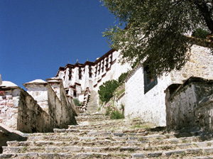 Jeszcze mniejszy jest wokół najświętszego tybetańskiego sanktuarium, klasztoru i świątyni Jokhang w starej części Lhasy. Ale o nim napiszę osobno. W przeszłości, aż do zajęcia Tybetu przez Chińczyków, był jeszcze wielki krąg pielgrzymi wokół całej starej części świętego miasta. Mijamy ich, wspinamy się po bocznych schodach od wschodu. Na każdym kroku spotykamy żebraków, przeważnie dzieci.Umorusane, w brudnych ubraniach, ale nie nachalne. Pokazując drobne banknoty trzymane w dłoniach, dają znaki, rzadziej rzucają niewyraźnie „money”, aby ich wspomóc. Pod jakąś skałą obok schodów siedzi mnich w średnim wieku z proszalnie wyciągniętą prawą dłonią i paroma banknotami leżącymi na ziemi przed nim. Obok niego o skałę oparty jest duży młynek modlitewny na długiej pałce.