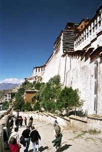 Zwłaszcza, że zwiedzanie odbywa się w dosyć ostrym tempie. Przewodnicy poganiają, bo chętnych do zobaczenia pałacu Potala wewnątrz jest więcej, niż wynosi przepustowość udostępnionej trasy. Prowadzącej przez budynki, sale, korytarze, schody, tarasy, place. Cudzoziemcy w zorganizowanych grupach i tak są uprzywilejowani. Wchodzą bocznym wejściem. Idąc mijamy pątników którzy w zwartym szeregu, jeden za drugim okrążają rytualnym pochodem kora wzgórze Marpori na którym stoi pałac.