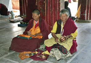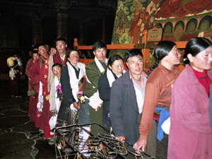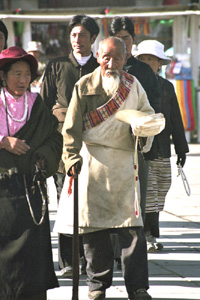 Pielgrzymi suną w rytualnym pochodzie kora zgodnie z ruchem wskazówek zegara drogą pątniczą po Barkhor Tromsung. Kręcąc, również w tym kierunku, ozdobnymi młynkami modlitewnymi trzymanymi jak każe obyczaj w prawych dłoniach, lewymi przesuwając paciorki buddyjskich różańców. Jedni szepcą mantry idąc w skupieniu bliskim ekstazy, inni na luzie, nawet rozmawiają ze sobą.Starzy, kobiety i mężczyźni podtrzymywani przez młodszych. Dużo jednak młodych, nawet niemowląt niesionych przez matki. Sporo mnichów w tradycyjnych nakryciach głowy, ale i modnych tu kowbojskich kapeluszach. Większość pątników w ciepłych wiejskich ubraniach. Kobiety w wełnianych spódnicach z wielobarwnymi fartuchami z przodu oraz bluzach i kurtkach.