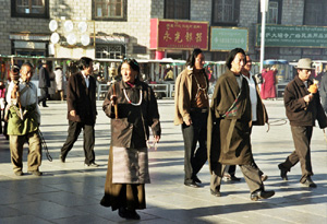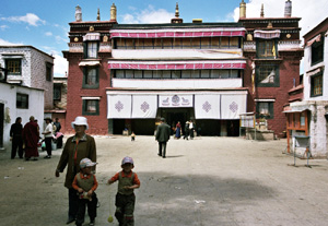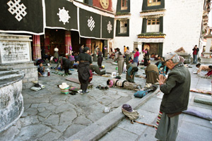 Pielgrzymi ze złożonymi do modlitwy dłońmi biją pokłony. Wielu robi to na klęczkach kładąc się z wyciągniętymi rękoma na ziemi i dotykając do niej czołami, w ten sposób posuwając do przodu. Jakże mi to przypomina portugalską Fatimę i naszą Jasną Górę, bądź sceny w sanktuariach islamu. Ale jestem przecież na Dachu Świata, przed najświętszym miejscem dla tybetańskich buddystów, świątynią Jokhang w Lhasie. Przyszedłem tu zaraz po dojeździe z lotniska i zostawieniu bagaży w hotelu. Należało co prawda poleżeć i odpocząć ze dwie godziny aby organizm przyzwyczaił się do zmiany wysokości – Lhasa leży na ponad 3,5 tys. m n.p.m. – ale bez problemów zdrowotnych bywałem już znacznie wyżej. A z hotelu położonego tuż przy Barkhor, starej, fascynującej, pełnej życia przez całą dobę dzielnicy tybetańskiej stolicy, mam tu zaledwie kilka minut spaceru. Będę więc przez parę dni częstym gościem. Z uwagą poznaję ten nowy dla mnie świat.