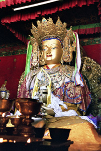 Ale głównym celem pielgrzymek oraz miejscem największego ścisku i tłoku z trudem regulowanego przez mnichów i strażników, jest kaplica Siakjamuniego ze sławnym posągiem Buddy przywiezionym w VII w. z Nepalu przez księżniczkę Bhirkuti. Oczywiście, mając czas i wytrzymują napór tłumu pątników oraz trochę gryzący w oczy dym lampek oliwnych, warto zobaczyć o wiele więcej.