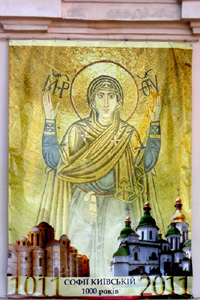 Już z daleka moją uwagę przyciąga ogromny, niemal na całą kilkumetrową wysokość muru Soboru Sofijskiego, płócienny plakat z reprodukcją najwspanialszej XI–wiecznej bizantyjskiej mozaiki z tej świątyni, Matki Bożej Oranty – z rękoma wzniesionymi do modlitwy.