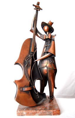 Tak np. „Kontrabasista” to postać we fraku, ale z krótkimi rękawamki, kapeluszu, z niewielkim brzuchem, głową zaznaczoną tylko kulą i rękoma…bez dłoni. Którymi gra na asymetrycznym instrumencie ze strunami rozrzuconymi jak postronki. Piękna „Harfistka” jest tak zapamiętała w grze, że zrywa struny.
