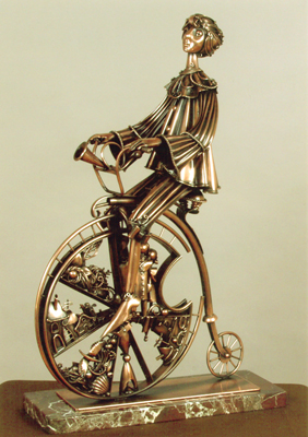 Chociażby „Cyklista” jadący na archaicznym rowerze z początków budowania tych pojazdów. Z wmontowanymi w szprychy wielkiego przedniego koła widokami mijanych miast i zabytków. A zwłaszcza „Spacer króla”. Brzuchatego, w koronie i z orderem, prowadzącego na smyczy ulubionego prosiaczka.