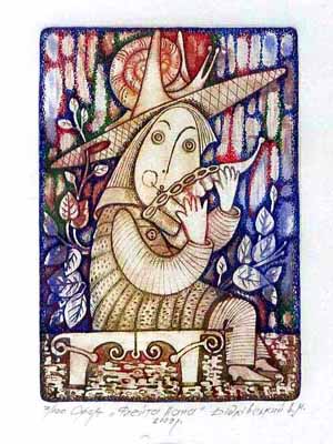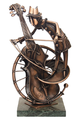 „Skrzypek” grający jedną ręką na instrumencie trzymanym w zębach, z drugą, z której ulatują nuty – dźwięki, nad głową. Czy „Kontrabasista” grający stojąc na półksiężycu otaczającym większy od muzyka instrument. Ale również z elementami symbolicznymi, czy wręcz filozoficznymi.