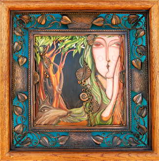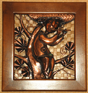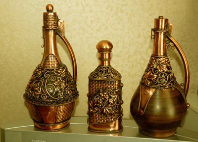 Artysta lubi zresztą, i robi to z powodzeniem, łączenie miedzi z drewnem. Chociażby trzy karafki – butelki pokryte drewnem i pięknie zdobione miedzią. Przez pewien czas zajmował się też akwafortą, może jeszcze do tego wróci, jubilerstwem itp. Gdy byłem u Didkowskich w sierpniu, Sława bardzo intensywnie pracował nad „Aniołami”.