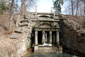 Trafiłem tu podczas znacznie opóźnionej w tym roku wiosny, dzięki czemu oglądać mogę ukształtowanie terenu i wszystkie obiekty, także niewielkie rzeźby, nie zasłaniane przez roślinność liściastą. Równocześnie jednak park nie ma tego uroku jaki tworzy bujna roślinność oraz bijąca do góry fontanna. Bo kaskady wody, chociaż nie pełną mocą, spadają.