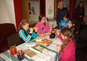 Panie prowadzące zajęcia zdradziły nam, w jaki sposób pozbywają się zawartości skorupki po zamienieniu jajka w pisankę. Bo nawet ugotowane na bardzo twardo, nie nadają się one do długiego przechowywania. W jeszcze mniejszym stopniu, jako bardzo łamliwe, wydmuszki. Otóż po ozdobieniu pisanki różnorodnymi wzorami, jest ona delikatnie obstukiwana na obwodzie tak, że skorupka pęka.