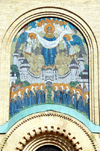 Do wnętrza nie udało nam się wejść, gdyż było zamknięte na głucho. Ale to co mnie najbardziej interesowało – mozaiki Rericha, są przecież na zewnątrz. Nad głównym oraz bocznym wejściamii do świątyni.Pora chyba wspomnieć kim był Mikołaj Rerich ( 1874 – 1947 ), którego imię i nazwisko w zachodnich źródłach i encyklopediach pisane jest jako Nikolai ( ew. Nicholas ) Roerich. Sądzę bowiem, że poza znawcami i miłośnikami malarstwa, ale także literatury i podróży, nie jest ono szerzej w Polsce znane.