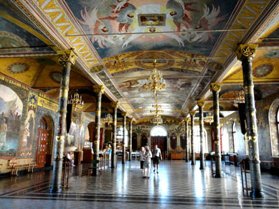 Ogromna, długa, chociaż bynajmniej nie wąska sala, dobrze oświetlona z jednej strony przez wielkie okna, przypomina te wielkie balowe, które widziałem w Wersalu, wiedeńskim Schönbrunnie i wielu innych pałacach. Ale tu ściany oraz strop podtrzymywany przez dwa rzędy wysmukłych okrągłych kolumn pokryte są malowidłami o tematyce biblijnej i religijnej.