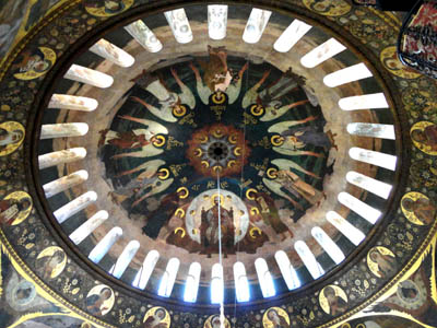 Z zewnątrz kopuła ta jest zielono – złota. Wewnątrz natomiast, na sklepieniu, pokryta jest freskami z postacią Chrystusa siedzącego na tronie i otoczonego przez anioły. A na pasie poniżej okien podobiznami 16 świętych mnichów pieczerskich. Z centrum kopuły zwisa ogromny złocony żyrandol.