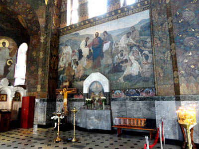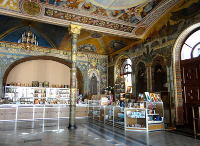 Cerkiew Trapeznaja, czytam w informacji na ścianie wystawy Odrodzonych Skarbów Sztuki Sakralnej w Ławrze, zbudowana została według projektu architekta W. Nikołajewa i nadano jej wezwanie wielebnych Antonija i Feodosija (Antoniego i Teodozjusza) Pieczerskich 13 sierpnia 1895 roku.