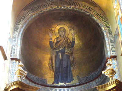 Modlącej się, z uniesionymi w górę dłońmi, do syna, Chrystusa Pantokratora – Władcy Świata, którego mozaikowy wizerunek otoczony postaciami czterech archaniołów wypełnia wnętrze centralnej kopuły nad nawą główną i spogląda w dół na obraz Matki i wiernych. O ile jednak te mozaiki są dobrze oświetlone przez okna w latarni kopuły, Oranta tonie w mroku.