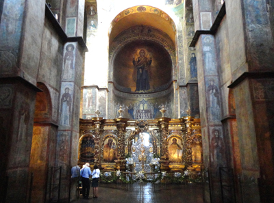 Podczas zwiedzania mój Cicerone zwracał mi uwagę na inne staroruskie – i ich tematykę biblijną, historyczną, symboliczną – mozaiki oraz freski na ścianach, stropach, kolumnach i ich łukach. W wielu miejscach odsłoniętych tylko częściowo, z pozostawieniem późniejszych przemalowań, gdy z oryginalnych, z X-XI wieku nic nie zachowało się.