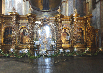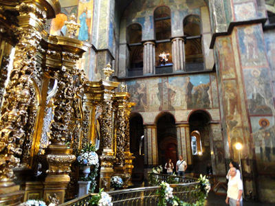 Nierzadko część postaci świętego lub sceny religijnej w najstarszej wersji, a resztę z późniejszymi przemalowaniami. Z wielu szczególnie ciekawych fragmentów wnętrz trudno pominąć bogaty ikonostas ołtarza głównego ze srebrnymi Carskimi Wrotami. Przechodził on też różne koleje losu.