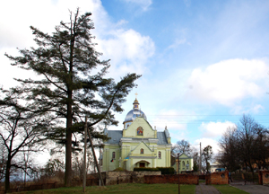 Cały ten zespół architektoniczny stoi w odległości kilkuset metrów od cerkwi na obrzeżu miasteczka. Jest to drugi tutejszy zabytek wart obejrzenia.Pierwotnie, przez kilka wieków, był kościołem katolickim p.w. Trójcy Świętej i Wniebowzięcia NMP.Ufundowali go, jako drewniany, w roku 1484, wraz z utworzeniem tu parafii, bracia Andrzej i Marcin Świrscy.