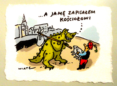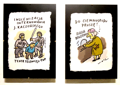 Druga ekspozycja, na parterze, prac Tomasza Wiatera, stanowi prześmiewcze spojrzenie na naszą rzeczywistość, z bardzo dużą dawką antyklerykalizmu. Chociaż nie tylko. Wśród około 300 pokazanych prac, wybranych spośród 5 tysięcy, nie brak także ostrej tematyki politycznej – z wyraźnym brakiem sympatii autora do PiS i „dobrej zmiany”, historycznej (kpiny z komunizmu i antykomunizmu, żołnierzy wyklętych) oraz społecznej i obyczajowej.