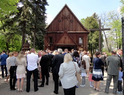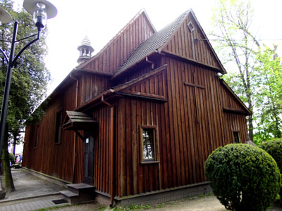 Podczas szwedzkiego potopu zarówno ona, jak i świątynia, padły jednak ofiarą ognia i zniszczeń. Po wielu latach zakonnicy w 1717 r. odbudowali, a faktycznie wznieśli nowy, zachowany do naszych czasów, kościół z drewna modrzewiowego. Wieńcząc go na dachu wieżyczką z sygnaturką i żelaznym krzyżem. Kilka metrów na prawo od wejścia na teren kościelny zbudowali też dzwonnicę, w której w 1734 r. zawisły dwa spiżowe dzwony.