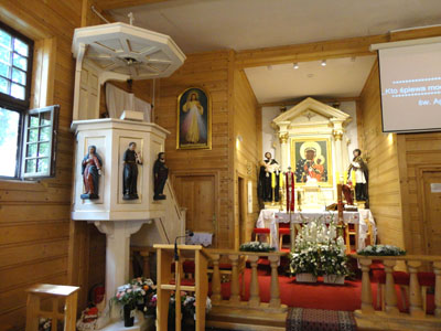 Ładnie ogrodzony ma nową Drogę Krzyżową dookoła świątyni z rzeźbionymi w drewnie stacjami, wspomnianą drewnianą dzwonnicę oraz również wyrzeźbioną w drewnie figurę Chrystusa Frasobliwego umieszczoną w dziupli uschłego i ściętego drzewa, ma za sąsiedztwo duży budynek plebanii nawiązujący architektonicznie do szlacheckiego dworku.