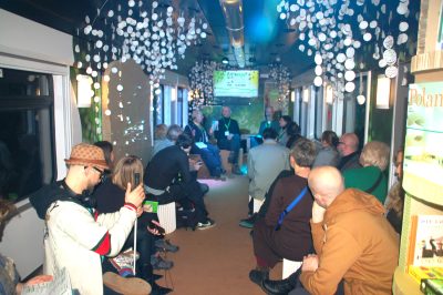 Na peronie powitała nas w imieniu organizatorów Agnieszka Zawadzka, Polka pracująca w Visit Berlin. Po wejściu do pociągu najpierw otrzymaliśmy do dyspozycji, zgodnie z miejscówkami kupionych biletów dwa przedziały w jednym z sąsiednich wagonów, aby w nich pozostawić bagaże i kurtki. Następnie przeszliśmy do „zielonego wagonu” ze specjalnie zaaranżowaną otwartą przestrzenią. Jest w nim recepcyjny punkt informacyjny z mówiącymi w obu językach paniami. A także materiałami informacyjnymi na temat „Pociągu do kultury”. Ku mojemu zaskoczeniu foldery i inne materiały promocyjne atrakcji swoich miast zaprezentował tylko Poznań. Nie pomyślała o tym, co uważam za poważny błąd, Warszawa.