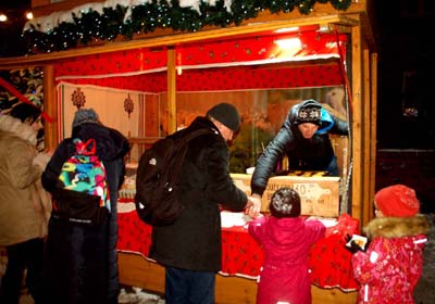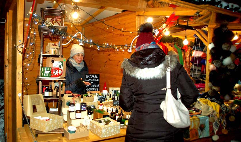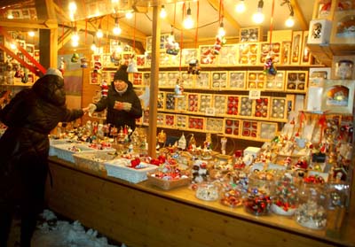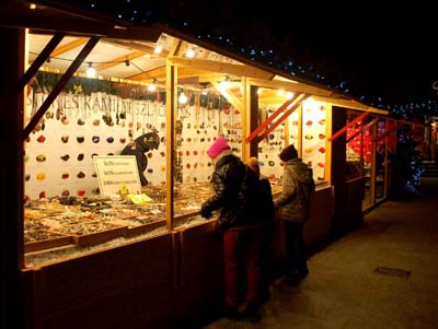 W wielu kramach sprzedawcy czekają: a może ktoś podejdzie i coś kupi? Przynajmniej późnym popołudniem i wczesnym wieczorem w dzień powszedni, gdy zwiedzam i fotografuję ten jarmark. Mimo niezłej pogody, z niewielkim mrozem, ruch jest niewielki. Głównie zresztą rodzin z dziećmi, które przyszły raczej na oglądanie, poczucie przedświątecznej atmosfery, niż na zakupy.