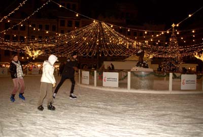 Więcej ludzi widzę w Rynku Starego Miasta. Głównie młodzież korzystającą z lodowiska. Ustawione dookoła niego kramy z gorącymi napojami i potrawami oraz przekąskami nie są oblegane, ale niemal w każdym widzę konsumentów. Obok języka polskiego słyszę rozmowy po angielsku, ukraińsku, niemiecku, w językach nie europejskich. To atrakcja również dla cudzoziemców.