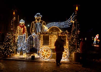 Chociaż wydaje mi się mają też witryny niektórych sklepów i placówek gastronomicznych. Główne, duże elementy dekoracyjne, są te same. Niewielka, barwna karuzela na Skwerze Hoovera. Oświetlony i z muzyką tunel z labiryntem i wieżyczkami koło przystanku autobusowego „Hotel Bristol”.