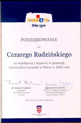 Tych, których praca i prezentowanie atrakcji turystycznych, kulturalnych, gastronomicznych itp. Chorwacji w pismach drukowanych, portalach, blogach i instagramach itp. oceniona została najwyżej, wyróżniono, podobnie jak w roku ubiegłym, Dyplomami – Podziękowaniami J.E. Ambasadora i dyrektorki przedstawicielstwa w Polsce ChWT: „Za współpracę i wsparcie w promocji chorwackiej turystyki w Polsce w 2021 r.”. Znaleźli się wśród nich także członkinie i członkowie SD-P „Globtroter”: Elżbieta i Andrzej Lisowscy z Krakowa oraz Adam Gąsior, Marzena Markowska, Jerzy Niemociński i wyżej podpisany.
