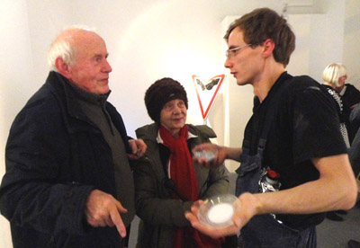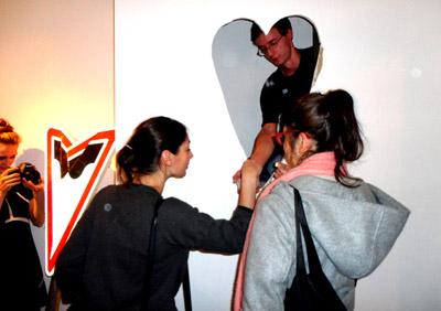 Zgodnie ze swoją metodą zaskakiwania widzów, artysta na wernisaż otwierający wystawę też przygotował kilka pomysłów. Podczas otwierających wystawę wystąpień attache ds. kultury ambasady wileńskiej w Warszawie p. Rasy Rimickaite oraz kuratorki imprezy Magdy Kardasz, najpierw spoza ścianki z kartono-gipsu dochodziły dźwięki borowania i przebijana się. Następnie widoczne stało się wypiłowywanie w niej serca.