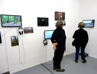 Na jednej ze ścian zauważyłem ponadto pojemnik z „wodą z Wilii”. W piwnicy, do której schodzi się stromymi, wąskimi i krętymi schodami, wystawione są wcześniejsze performanse artysty prowadzone w otoczeniu dzikiej przyrody. I to multimedialne. Część zdjęć znajduje się na ekranach, na których można nie tylko obejrzeć np. las z chodzącym po nim jeleniem i artystą w masce chyba sępa, ale zakładając wiszące obok słuchawki, także usłyszeć leśne odgłosy.