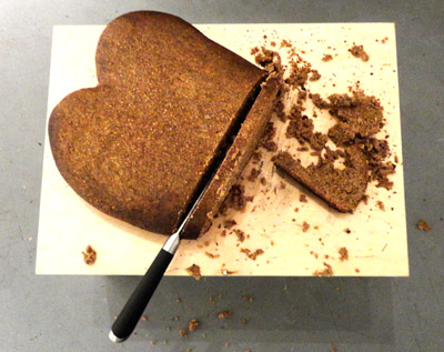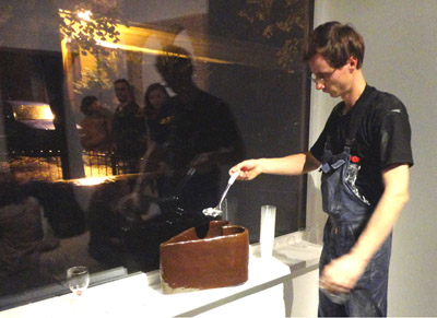 A gdy już zostało ono wycięte, w otworze pojawił się artysta częstując gości cukierkami w kształcie serca. Po chwili wyszedł przez wykonany przez siebie otwór i raczył ich, z ceramicznego naczynia o kształcie serca, wodą, być może z jakimiś dodatkami, nazwaną „Serdecznym eliksirem”. A w trzecim etapie wernisażu kroił upieczony przez siebie chleb, oczywiście również o kształcie serca, i jego kromkami częstował chętnych.
