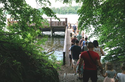 Nie zaglądałam, by uniknąć tłumu, który popędził tam zgodnym truchtem. Po półgodzinnym postoju na łące kolejka wyrusza w drogę powrotną. Zatrzymała się na przystanku Powały. Tu można było zejść ze sporej skarpy na brzeg jeziora i spojrzeć z pomostu na wodę.